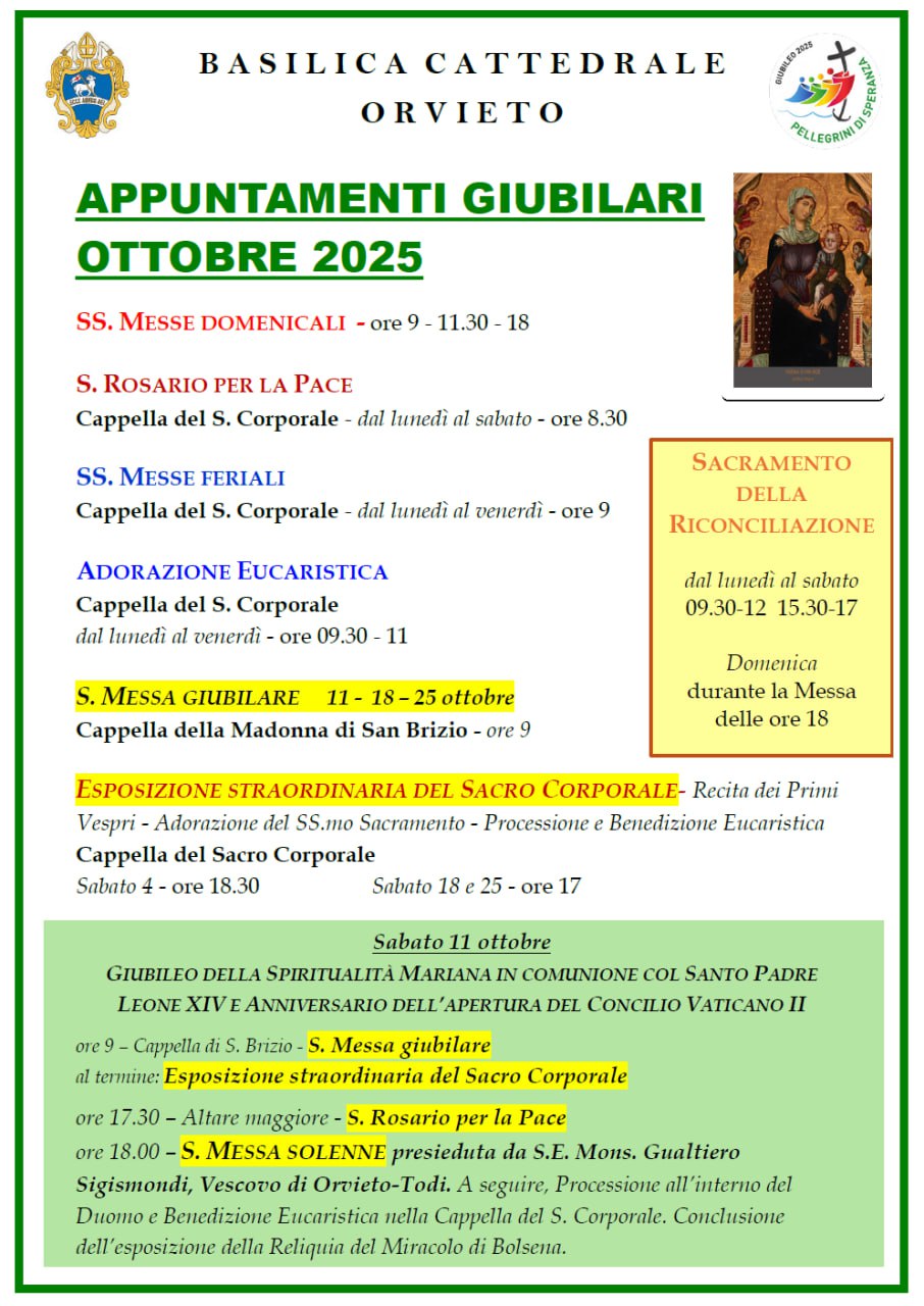 La Basilica Cattedrale di Orvieto rende noto il calendario degli Appuntamenti Giubilari per il mese di ottobre 2025, nell’ambito delle celebrazioni legate al Giubileo dei “Pellegrini di Speranza”.