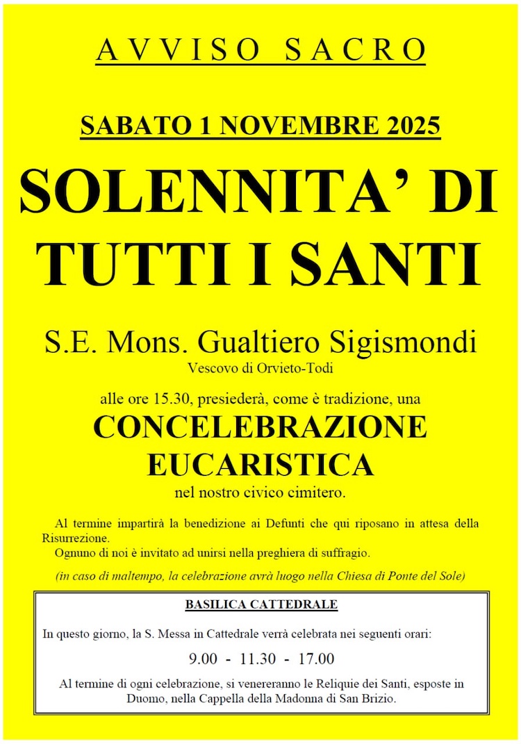 Nel pomeriggio, alle ore 15.30, S.E. Mons. Gualtiero Sigismondi, Vescovo di Orvieto-Todi, presiederà come da tradizione una concelebrazione eucaristica presso il civico cimitero di Orvieto. Al termine della celebrazione, sarà impartita la benedizione ai Defunti, in un momento di raccoglimento e memoria condivisa.