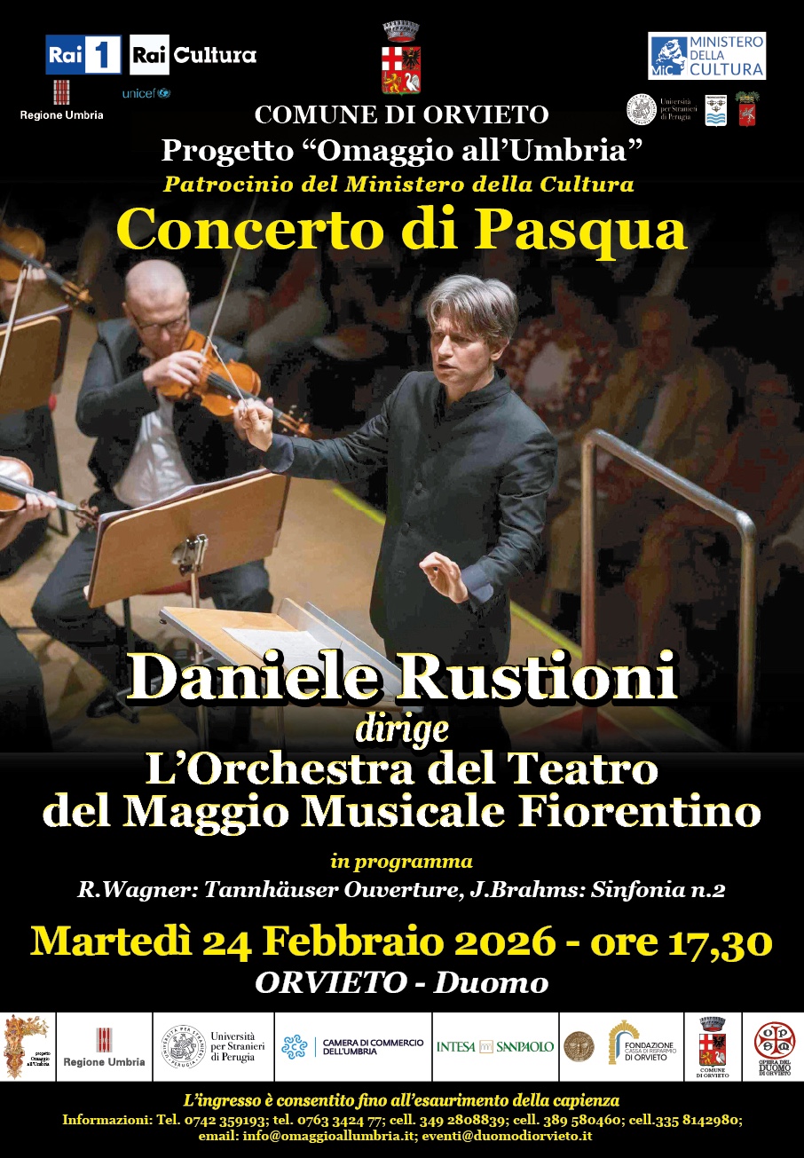 Martedì 24 febbraio 2026 alle ore 17:30, nel Duomo di Orvieto, nell’ambito del progetto "Omaggio all’Umbria”, si terrà il tradizionale Concerto di Pasqua della Rai dell’Orchestra del Teatro del Maggio Musicale Fiorentino, diretta dal Maestro Daniele Rustioni.